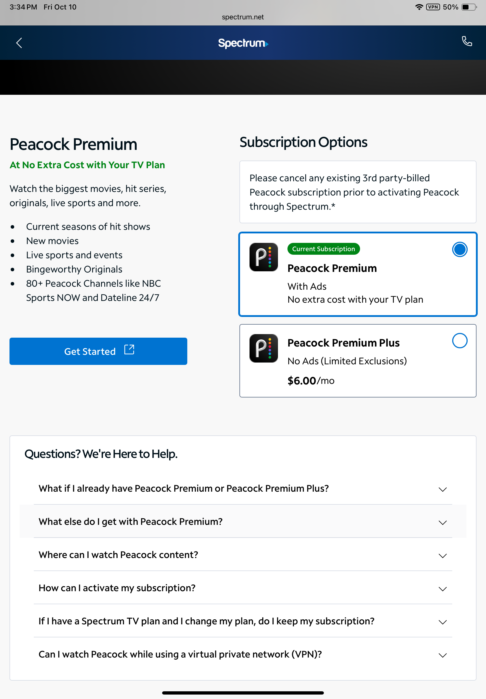 Remember Peacock through Spectrum requires a Spectrum TV subscription to any Spectrum Select package. New accounts or swapped equipment may take 48 hours to activate online access.