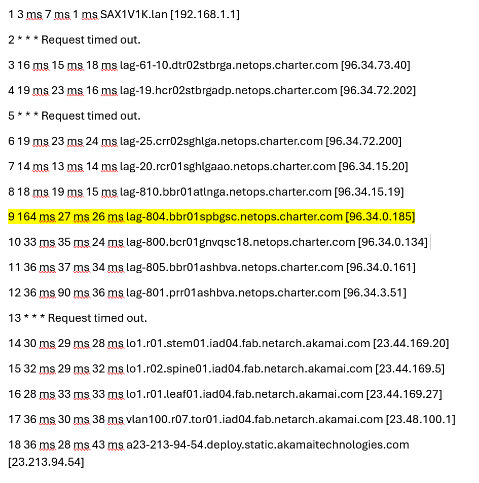 I ran a tracert and saw some latency at 96.34.0.185 which is a node upstream in the charter network. I ran a ping test while playing and saw some undesirable results. I tried calling spectrum and they insist on sending a tech even though the issue is not local to me. The IP address is the 9th hop in my tracert, and is upstream in their network. What are my options here?