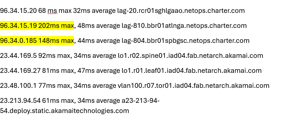 Neighboring hops and downstream Akamai nodes are stable by comparison (avgs mid-30s to 40s). Please escalate to network engineering to check utilization, buffer/queue depth, and error counters on these interfaces (LAGs) and adjust routing if necessary. This is causing high Transport Network (TN) latency in online games. I have included all network hops that had above 60ms peaks and highlighted the two backbone routers that have the largest latency spikes