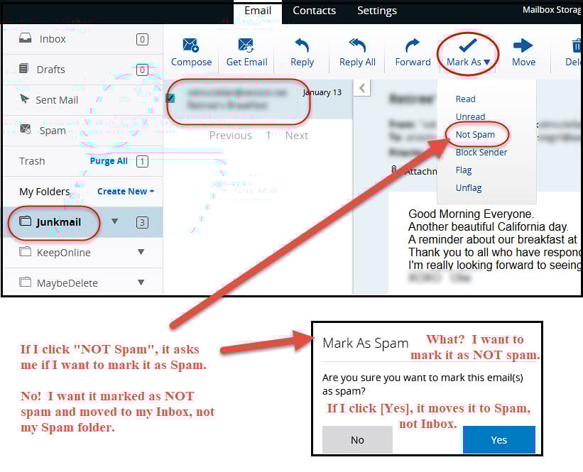 If a legitimate message goes to Junkmail and I select "Mark As —> Not Spam", I get a "Mark As Spam" dialog box. I should be getting a "Mark as NOT Spam" box and it should move the message to my Inbox, not my Spam folder.