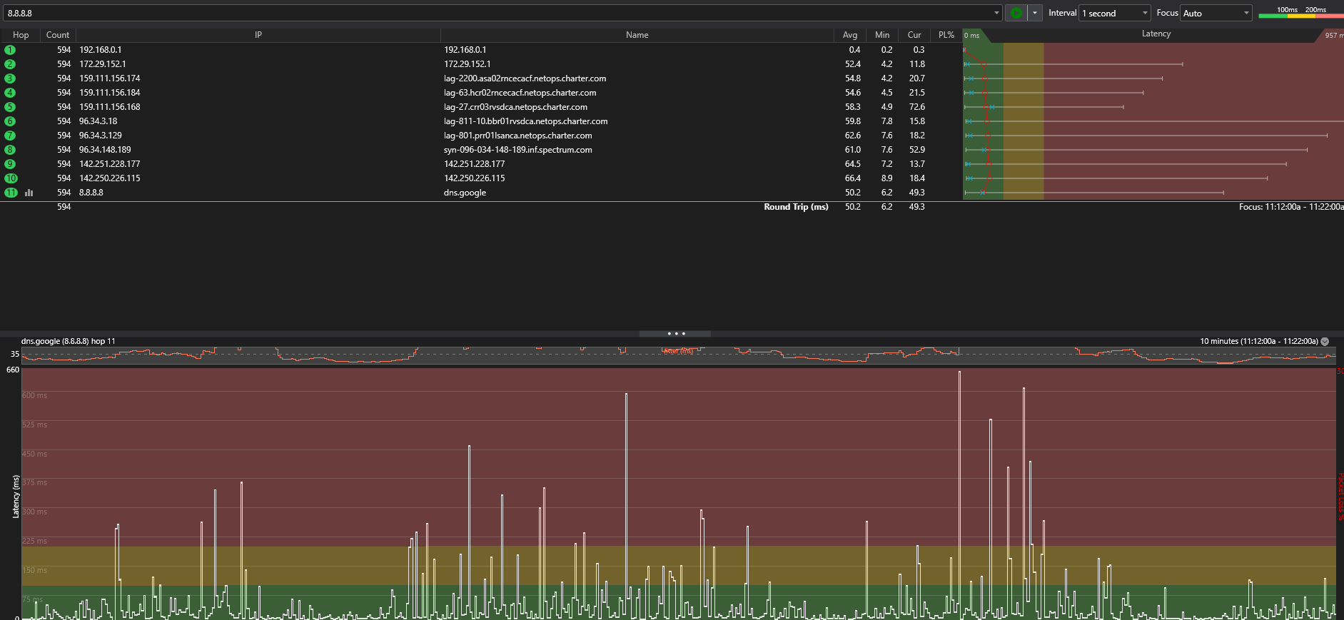 Welcome to the Community Forums. I can understand the concern about latency issues. I reviewed your data you provided and it does not indicate an issue on the network. I do see the spike on the 5th hop but it does not continue passed that hop. If there was an issue, you would see that continue or be higher on each hop after. The spike you are seeing is related to a security feature called ICMP Filtering that prevents DDOS attacks. Your average ping is high from the start. That indicates that there would be an issue at your home. I reviewed your modem history and I see some history of the modem being offline for long periods during the last few days and the modem is currently showing some packet loss. I see you recently had a service call but the technician was not able to identify an issue at the time they were there. I would recommend we get a technician back out to have it looked into further.