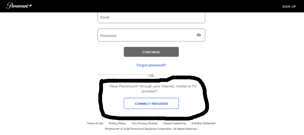 when I try to log into the paramount plus included with my plan with the “connect with provider” option it gives me “complete registration” and will not let me proceed - everything is grayed out. Any suggestions?